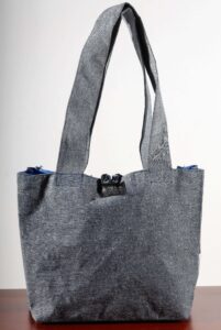 Stylish tote bag with brass Adinkra motif and contrasting embroidery.  Made from the finest Japanese denim scraps.